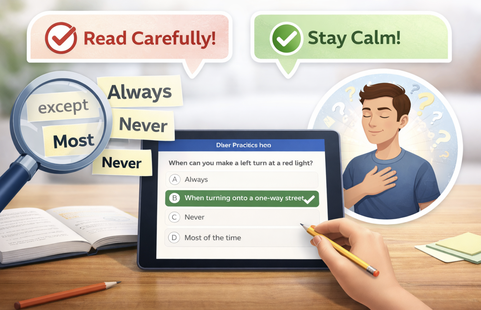 If a question feels tricky, slow down and read every word. Many test mistakes happen because students rush, miss one keyword, or answer what they think the question says instead of what it actually says.